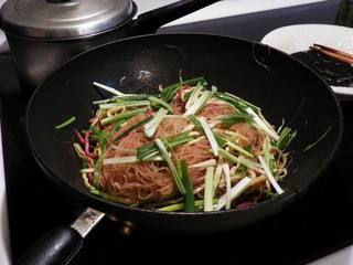 炒粉可做正餐,也可做早餐,下料也可灵活多变,冰箱有什么就放什么,没有界定的谱儿,特别是放了韮菜、韮黄、蒜苗或葱之类的,觉得特别香特别有食欲,再加少许辣椒酱,就更加完美了。