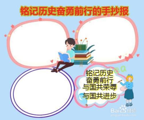 在边框的连接处画上我在看历史书籍的场景,在右下醒绵方画上我在黑板上写下铭记历史奋勇前行,与国共荣辱,与国共进步