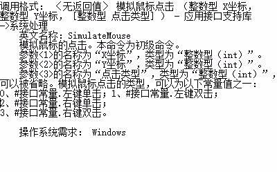 由于编辑框1、2的内容是文本,而参数1、2所需的是数值,所以必须使用“到数值”将文本型强制转换为数值,而参数3是可以自由选择的,分别是:0、#接口常量.左键单击;1、#接口常量.左键双击;2、#接口常量.右键单击;3、#接口常量.右键双击。