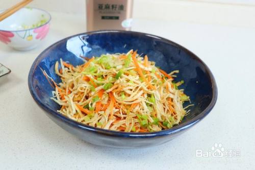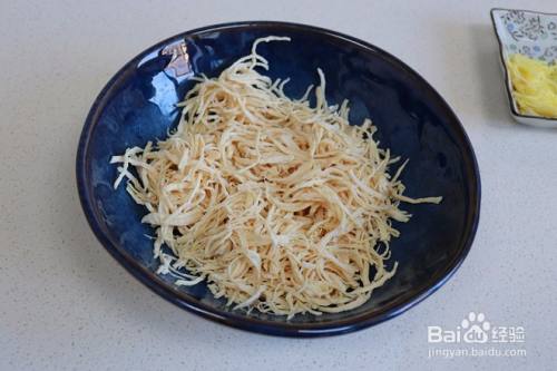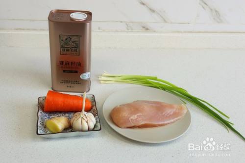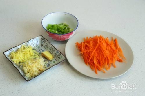 食材的准备工作:胡萝卜去皮洗净切丝、生姜洗净切丝、大蒜剁碎、香葱切好,鸡胸肉清洗干净。