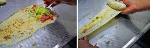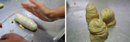 慢慢圈起,边抻面团,边卷,抻的越长到时候层数越多