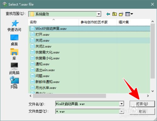 在弹出的对话框中,找到并选中你想替换成的开机音乐(必须是 wave 格式的音乐文件),再点击“打开”。
