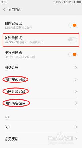 同时,在设置界面中,我们也可以进行其他设置,开启“省流量模式”,还可以“清除搜索记录”、“清除升级记录”和”清除商店缓存“等等,你可以自由设置。