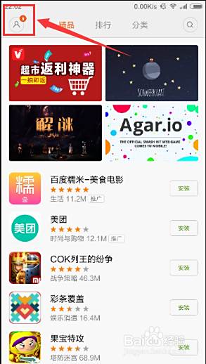 进入到应用商店主界面,在主界面的左上角有个小人的图标,那是个人中心,手机点击进入。