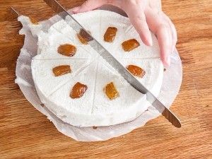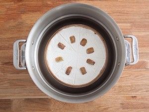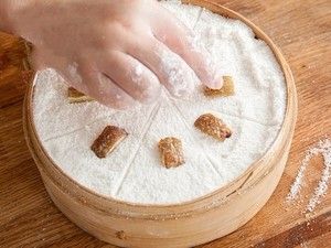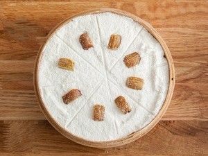 蒸笼铺上油纸,倒入过筛后的粉料,用刮板抹平。分8等分,放上蜜枣装饰。