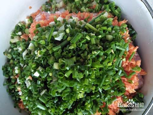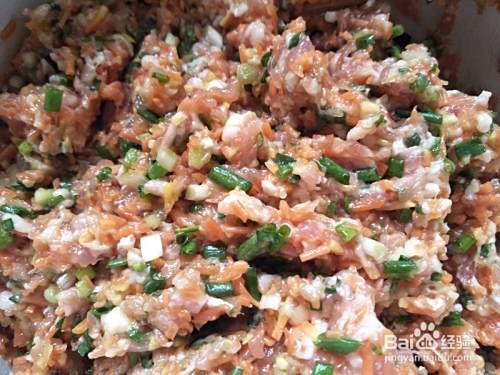 把多好的肉馅放在一个大的容器里面(我这里买的是成品肉馅),然后加入胡萝卜末,切好的葱末,打入一个鸡蛋,加入食用盐,味精,少许食用油和酱油均匀搅拌,饺子馅就做好了