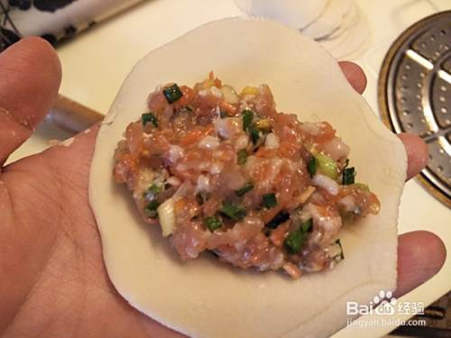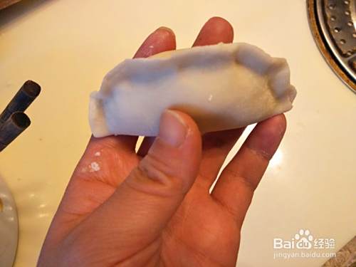 取适量的饺子馅抱在皮上,对折后把边缘捏好后,两手用力往中间捏,一个饺子就包好了