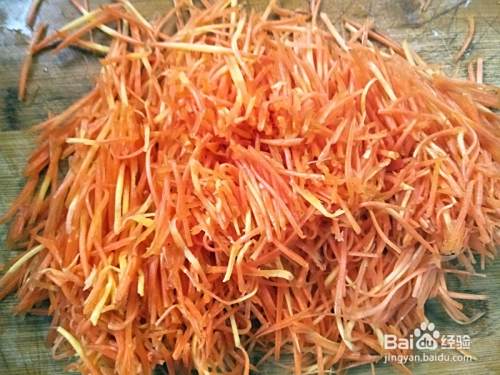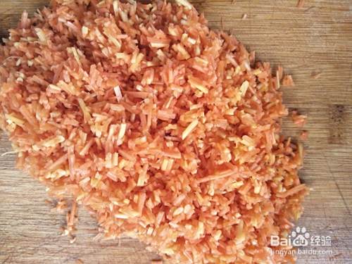 胡萝卜洗净刨成细丝,然后切成碎末备用