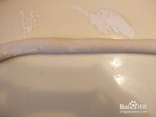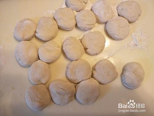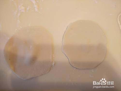 把面团揉至光滑,去除一部分搓成长条,再分成小份,用擀面杖干成小圆片,把所有的面团擀完,饺子皮就做好了