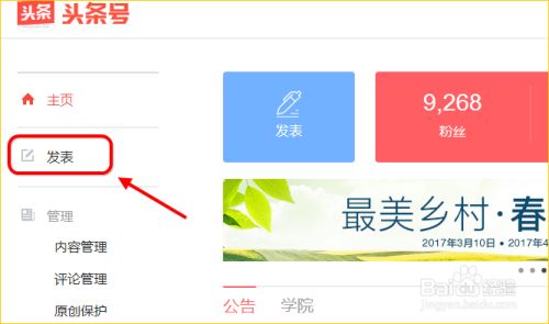 点击【今日头条】右上角【头条号】,进入【今日头条】作者个人操作中心。在头条号个人中心页面点击【发表】。