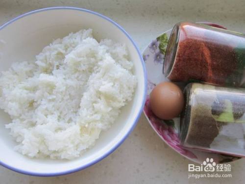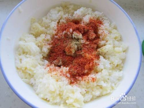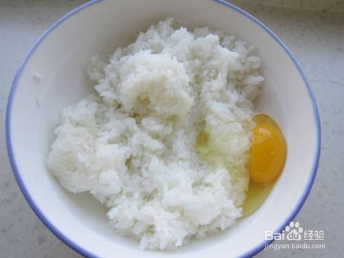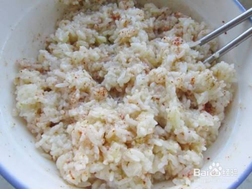 把鸡蛋打散加进热糯米饭里拌均匀。
