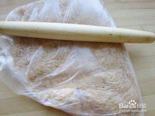 把拌好的米饭放进保鲜袋里, 像擀面团一样,擀到米饭发粘。