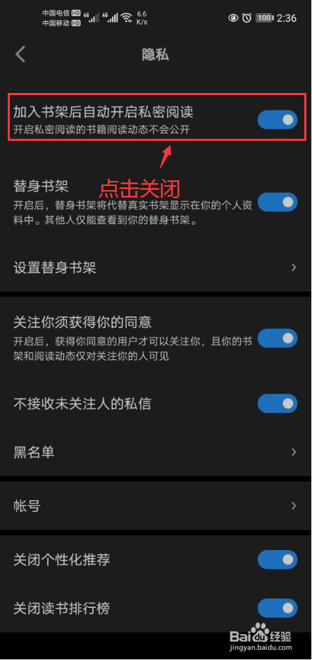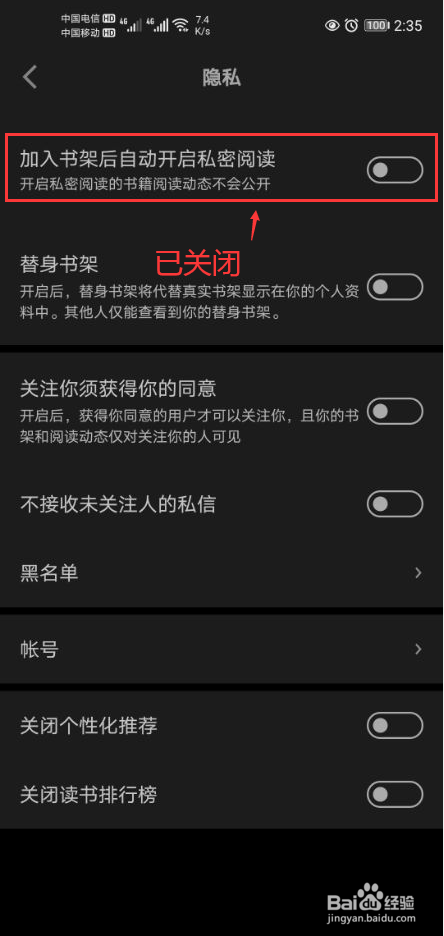点击关闭加入书架后自动开启私密阅读开关(图片中圈红的部分)