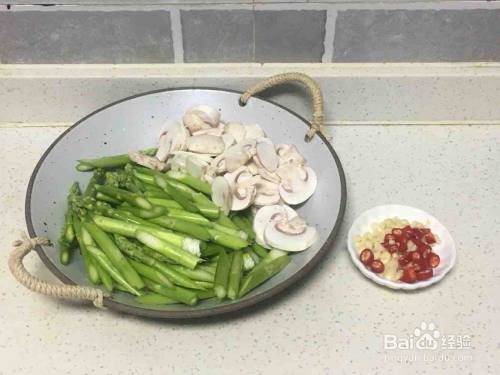 将食材清洗干净,芦笋切掉泛白的根部,再把绿色部分切成小段,而口蘑则切成薄片,大蒜和小米辣都切碎;