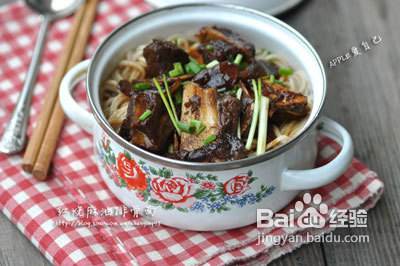 8、捞面,根据自己的喜好取面汤,放煮好的红烧排骨,浇排骨汤汁,撒葱花即可。