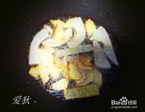 食材准备好了,炒锅加油,放入姜片,洋葱,炸到黄色的时候,捞出,只要姜葱油。姜葱不能留在菜里是因为葱煮烂了很难看,影响菜品的成色。