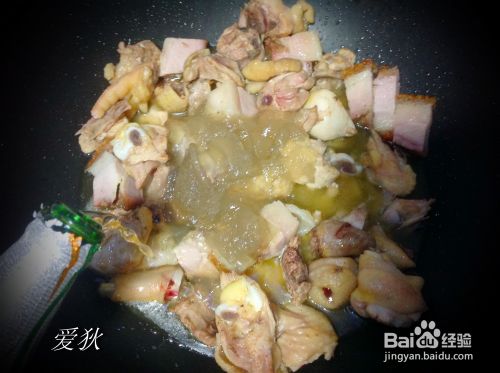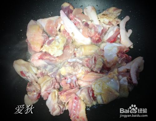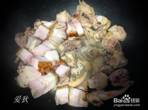 放入鸡块炒至鸡肉断生,再放入烧肉炒一下。