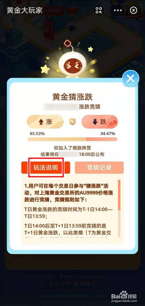 进入黄金猜涨跌窗口,点击玩法说明,有点绕,看清楚;