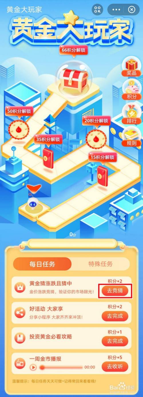 进入黄金大玩家游戏页面,经典的走格子游戏,每日任务中点击黄金猜涨跌后的去竞猜;