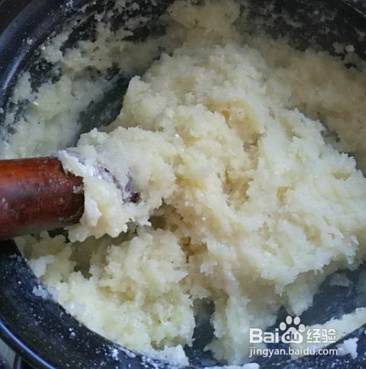 把锅坐在火上,中小火烧开,等白糖融化后,把面粉倒入锅中,迅速搅拌成一个不粘手的烫面面团,搅拌过程中要一直保持小火。