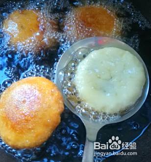 把炸糕坯子先放进漏勺中炸1分钟,等炸糕定形后,再把漏勺撤出来,放进油锅中,别着急,小火慢慢炸到漂浮起来,然后再把火稍微开大一点儿,油温升高,炸到表面金黄色,油炸糕就好了,捞出来控油。