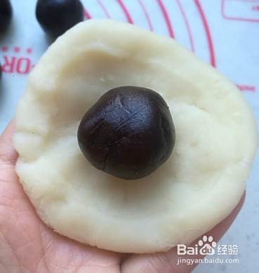 把面剂子仔细揉匀,把中间捏出一个小坑儿,包入1颗豆沙馅,用虎口把收口捏紧。