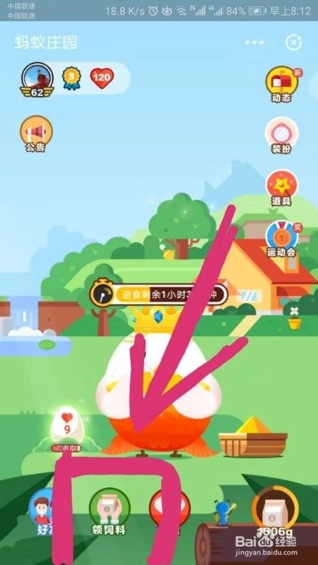 第三步,进入蚂蚁庄园之后,在小鸡的下面找到“领饲料”图标,然后点击它,如图所示。