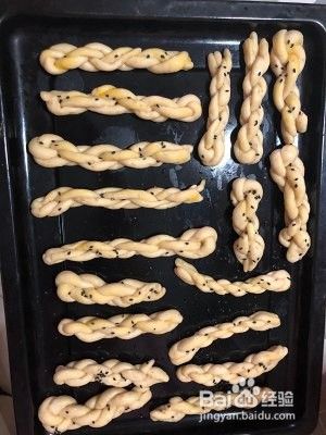 2根面团揉成麻花形状,麻花表面刷蛋黄液.撒黑芝麻. 面团进行3发.发至1.5倍就可以进烤箱