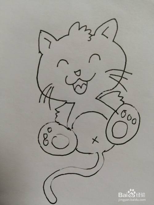 第六步,接着我们继续把可爱的小猫咪的两只小脚和身体画出来,注意小脚上花纹的画法。
