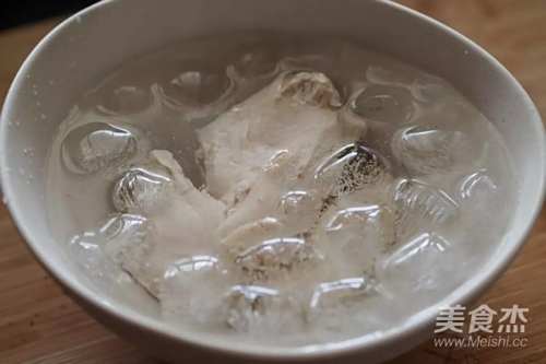 5煮好的鸡胸肉捞起,用凉水冲净后,放入冰水里浸泡一会儿。