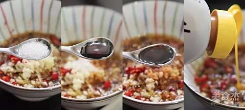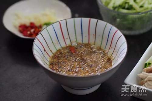 8红油里加入葱姜蒜末和辣椒圈,再加入白糖,生抽,陈醋,小鲜侶和适量饮用水。