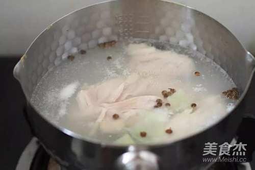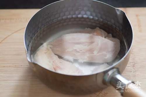 2浸泡完的水倒掉不用,锅里倒入清水,放入鸡胸肉放一勺料酒,几粒花椒和几片姜片煮沸后约再煮10分钟把鸡胸肉煮熟。