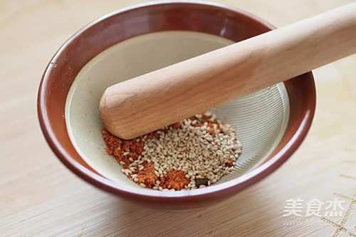 3煮肉的同时来研磨香料,把粗辣椒粉,十几粒花椒和少许白芝麻放入研磨碗,磨碎,使其香味充分释放。