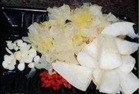 雪耳泡发以后,剪去蒂部,撕成小朵;