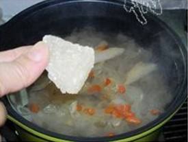 雪梨,雪耳,杏仁放进锅里,加入适量清水(我放了5碗);