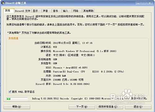 点击“开始”→“运行”,输入“DxDiag”(不包括引号),然后回车,便会打开一个“Dirext诊断工具”,这里会给提供cpu的型号、频率、显卡型号、显存大小、内存大小、声卡型号、鼠标等等信息。这个命令是查看笔记本电脑硬件信息非常简单、实用,希望大家都能记住。 -