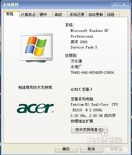 用鼠标右键点击“我的电脑”,选择“属性”项,在其中的“常规”栏中就会看到笔记本安装系统版本信息,cpu型号及频率信息,内存大小信息。 -