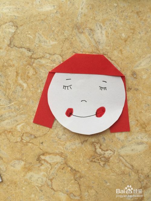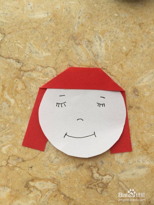 然后我们再用红色的纸做一个长方形,如下图一样粘在圆形的上面做娃娃的头发,并画上娃娃的眼睛还有嘴巴