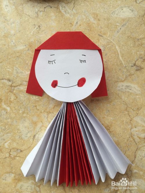 然后我们再把粘好的裙子粘到娃娃的头上面,我们的娃娃折纸就完成了。