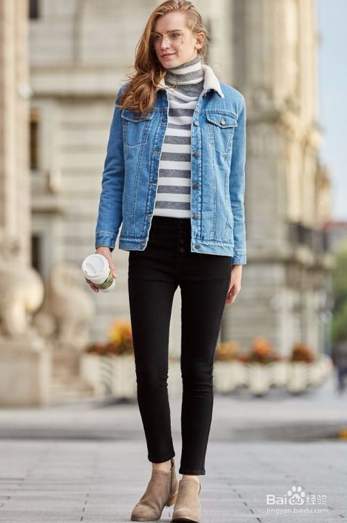 搭配二:加绒牛仔外套+灰白条纹高领毛衣+小黑裤