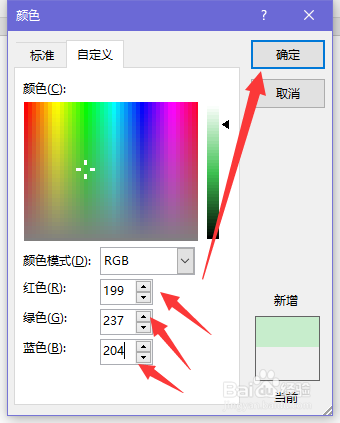 最后我们需要做的是,在自定义界面,输入对应的RGB分别是R:199、G:237、 B:204。
