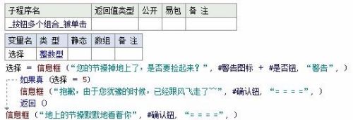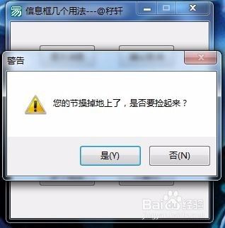 选择 = 信息框 (“您的节操掉地上了,是否要捡起来?”, #警告图标 + #是否钮, “警告”, )
