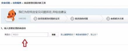 在卖家问题 > 自助服务 > 商品管理问题诊断工具处粘贴复制的宝贝ID,点击搜索