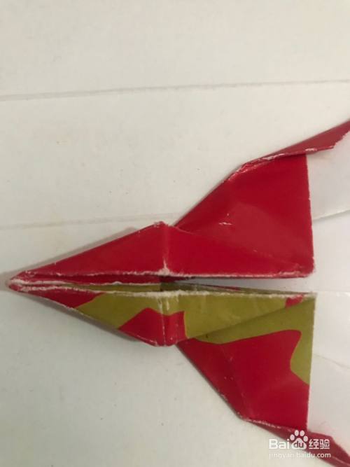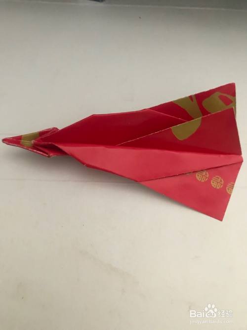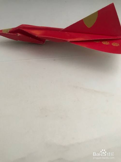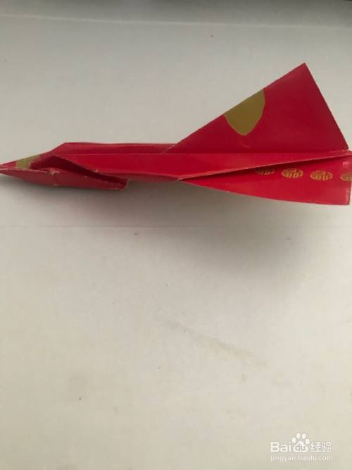 第九步 折倒一个翅膀之后 再把它上下翻过来折另一只翅膀 对齐同样折叠 然后拿起来整理一下分开两边的翅膀和后边中间的尾翅 再整理一下 一架酷酷的战斗机飞机就完成了