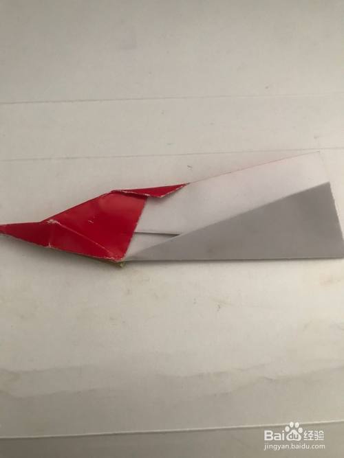 第四步 折好后 把左边的尖角顺双边向右折 然后再把左下角和左上角都向里沿中线折倒