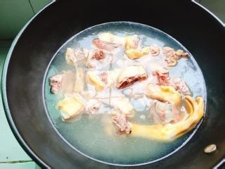 锅里放水,将鸭肉焯水,放入两片姜,捞出沥干水分