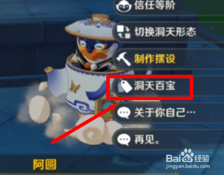 点击与壶里的阿圆对话,选择洞天百宝进入购买页面。