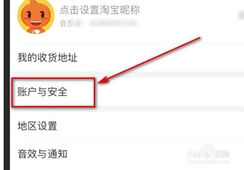 在淘宝设置界面选择账户与安全选项,点击进入账户与安全界面;