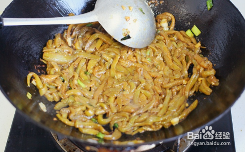 然后我们热锅起油,然后放入葱姜蒜爆炒一下,接着放入茄子丝丝。如下图