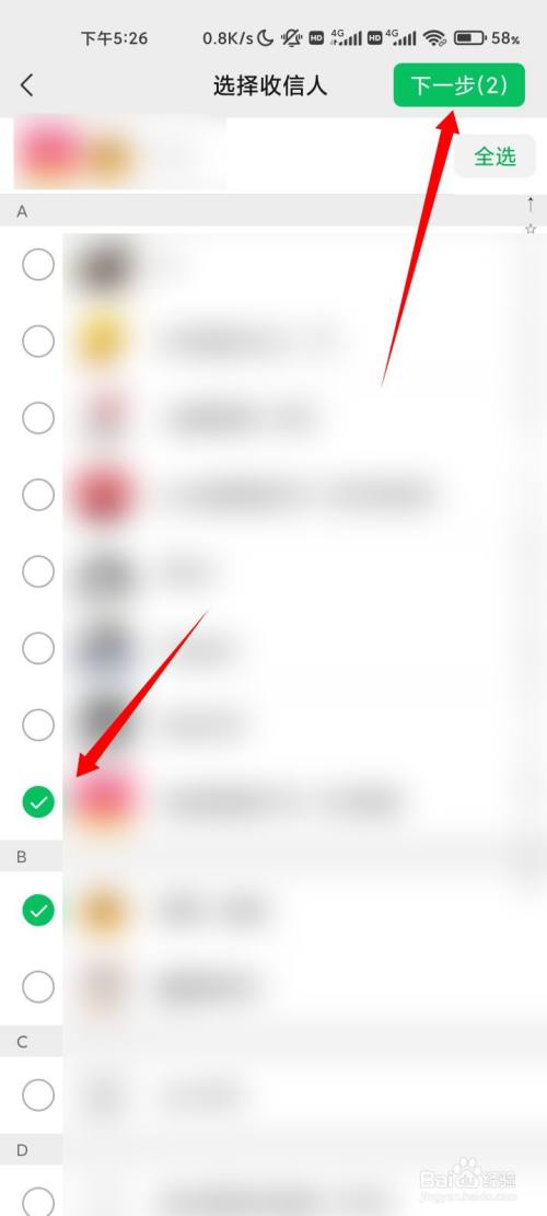 在列表中勾选想要发送消息的多个微信名,点击下一步的选项。